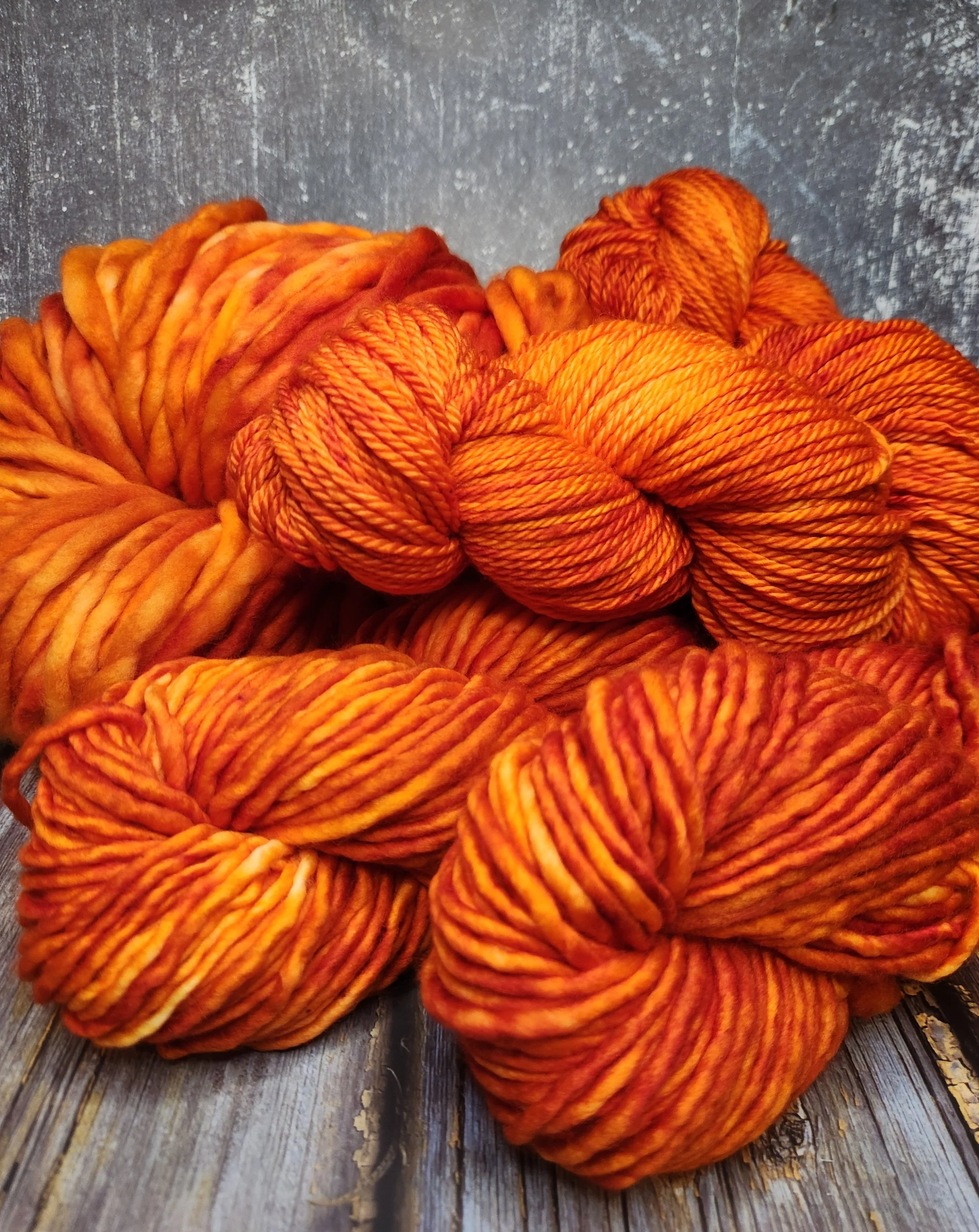 100% Superwash Merino Wool, Aran/Worsted weight in colorway: The Goblin King, approx. 182 yards